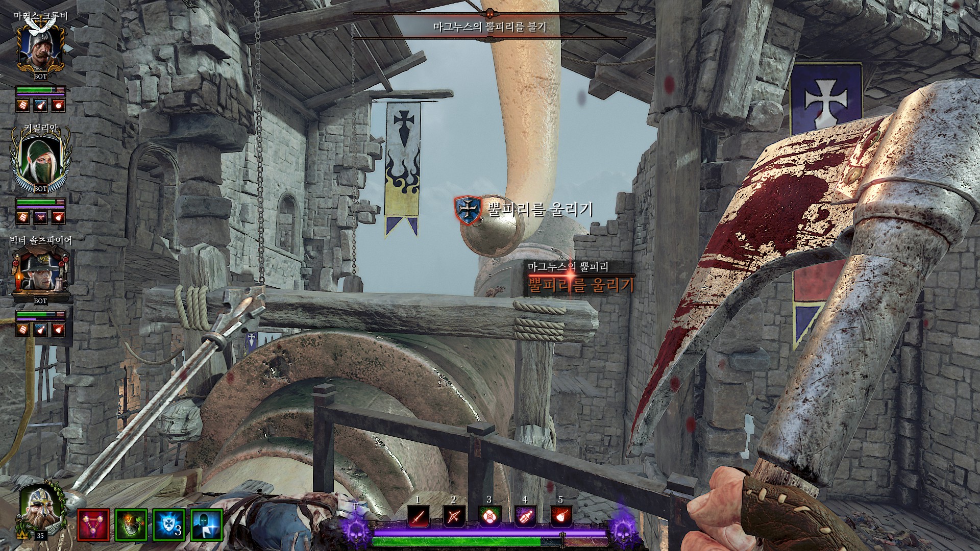 뿔피리를 불어 이곳이 공격당했음을 알립니다.