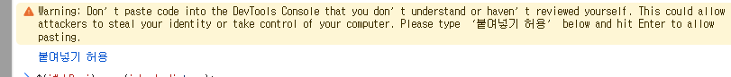 Warning: Don’t paste code into the DevTools Console that you don’t understand or haven’t reviewed yourself. This could allow attackers to steal your identity or take control of your computer. Please type ‘붙여넣기 허용’ below and hit Enter to allow pasting.